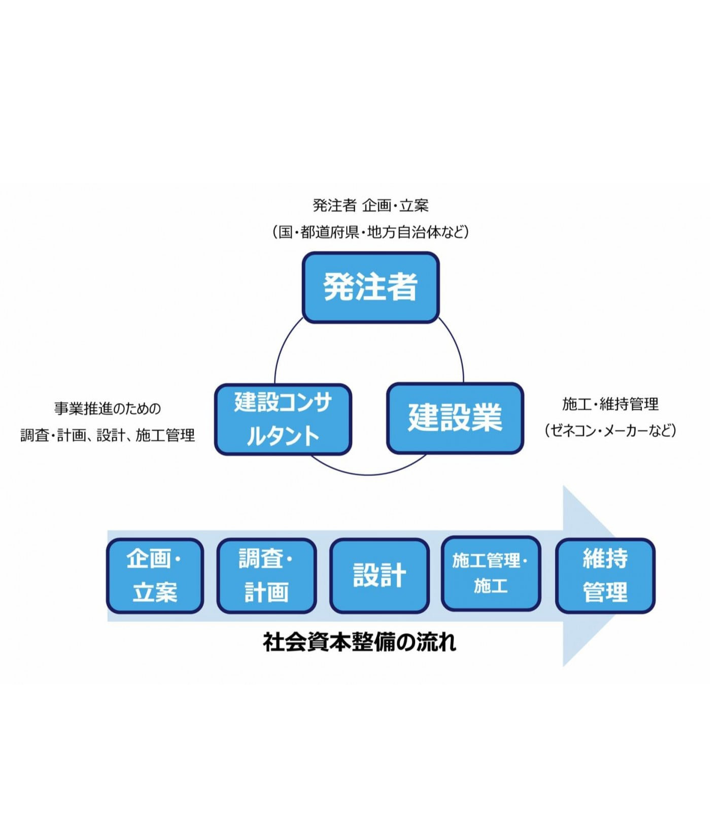 社会資本の整備は、企画・立案、調査・計画、設計、施工管理、維持管理の一連の業務が含まれています。建設コンサルタントは企画・立案、調査・計画、設計・施工管理が主な業務内容です。